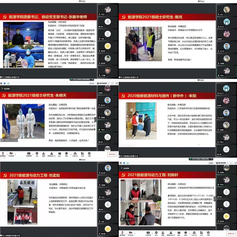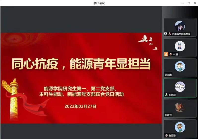 为了弘扬伟大的抗疫精神,重温战“疫”暖心瞬间,2月23日下午3点,能源学院研究生第一党支部、研究生第二党支部、本科生能动党支部和新能源党支部联合开展线上党日活动,主题为“同心抗疫,能源青年显担当”。党委书记沙丹丹,各学生党支部书记严若今、顾燕、张振华、胡碧洋,本科生辅导员魏义凡,全体学生党员和抗疫志愿者参会,会议由严若今主持。