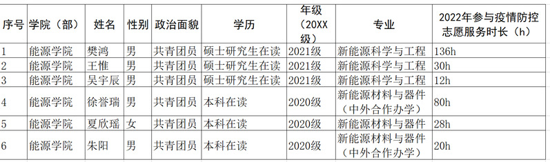 根据校团委《关于开展2022年“苏州大学抗疫之星”评选活动的通知》的精神,能源学院团委广泛动员,根据本科生、研究生各年级的申报情况,经过评审,拟推荐学院申报2022年“苏州大学抗疫之星”人选公示如下: