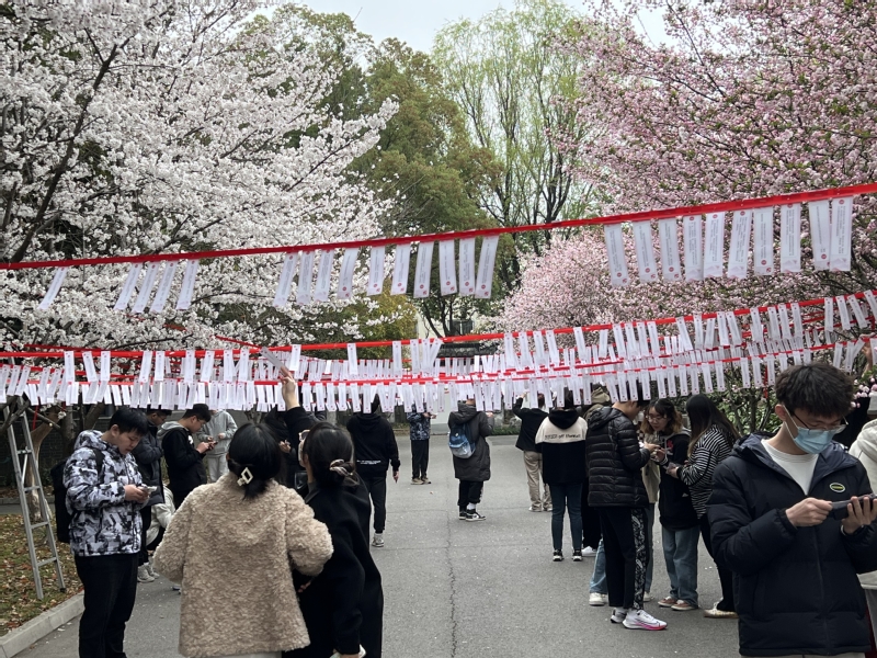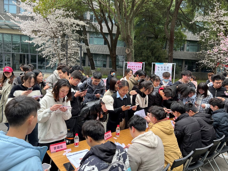 幸得三月樱花舞,从此阡陌多暖春。能源学院樱花大道两旁满树烂漫,樱花树间悬挂的串串竞答题卡如云似霞。竞答知识内容以党的二十大精神为主线,涵盖党的方针政策、党史、党规党纪等,题目形式丰富,重点突出。活动一开始,就迎来广大师生的参与热潮,寓教于乐的场景也吸引了能源学院刘忠范院士驻足,他兴趣盎然地阅读题目、观赏樱花,跟老师们同学们欢快地讨论着。