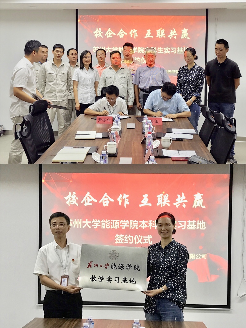参观结束后,双方就能源与动力工程人才的培养模式、课程设置和企业对人才的具体需求进行了深入的探讨与交流。尹冬年总经理和学院能源与动力工程专业系主任吴玺代表双方共同签署了《苏州大学能源学院本科生实习基地协议》,并与学院党委书记沙丹丹代表双方一同举行实习基地挂牌仪式。