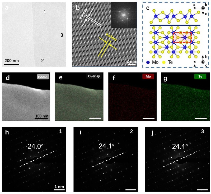 近日, 苏州大学邹贵付教授团队利用分子前驱体锚定法生长厘米级的单斜晶向MoTe2薄膜,并提出了锚定驱动生长的机制。该团队在10mm*10mm的蓝宝石衬底表面生长出了接近100%覆盖率的MoTe2薄膜,宏观照片和光学显微镜表征都证明了所合成薄膜的均匀,原子力显微镜的高度图也证明了所生长薄膜的厚度为标准的单层(0.73 nm)。