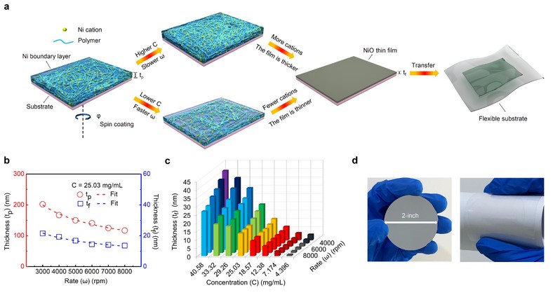 近日,苏州大学邹贵付教授团队提出了一种聚合物辅助准原子沉积的策略,实现了从原子层面上精准控制高质量氧化镍(NiO)薄膜的大面积生长。通过调控镍前驱体浓度和旋涂速率,精准生长40 nm到亚纳米级(0.92 nm)任意厚的NiO薄膜,并成功将其转移到柔性基底上,生长的柔性NiO薄膜有着良好的透光性和柔韧性。