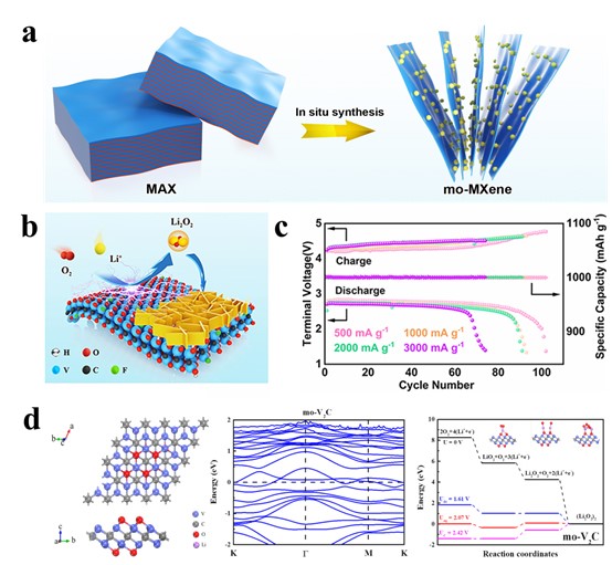 图1 (a)合成过程示意图;(b)放电过程示意图;(c) mo-V2CTx高倍率循环性能;(d)理论计算
