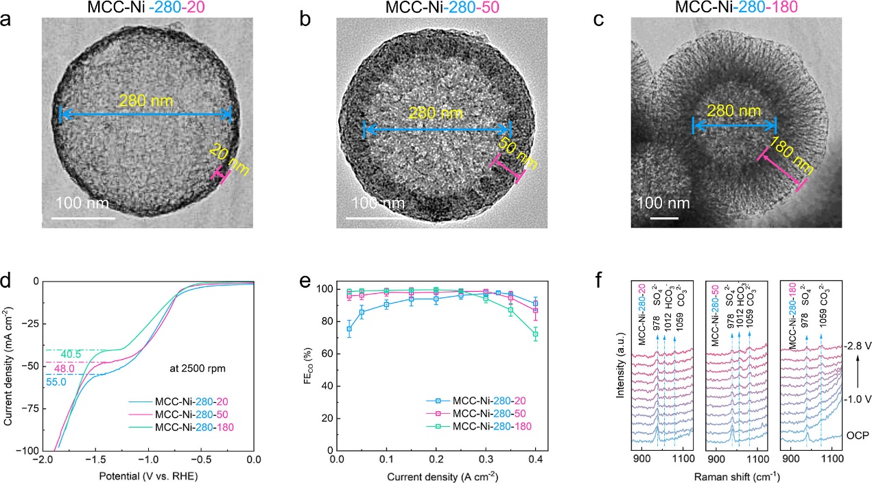 图4.调节MCC-Ni-280-y的壳层厚度y(y = 20、50和180 nm),调控与eCO2R相关的物质传输和局部化学环境。