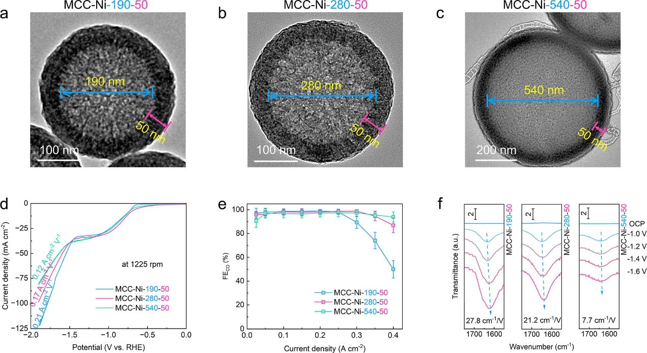 本研究所采用的Ni负载多孔碳纳米笼模型催化剂为MCC-Ni-x-y,其中x和y分别表示空腔内径和壳层厚度。如图Scheme 1b所示,该催化剂通过硬模板法合成,内径x可通过调控SiO2模板的尺寸控制,而壳层厚度y则由表面聚合过程中单体的浓度决定。随后,在去除碳化树脂涂层中的多余SiO2后,形成壳壁上的介孔结构,并通过氮锚定法将Ni活性位点引入至催化体系中。