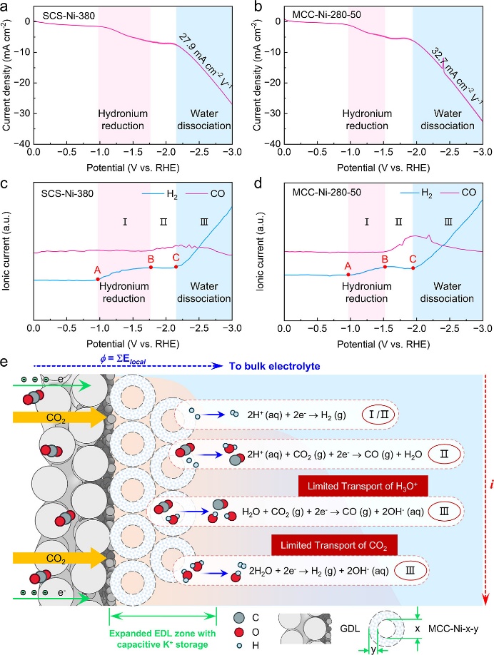 近日,苏州大学彭扬研究团队设计了一系列具有几何参数可调的Ni负载型多孔碳纳米笼模型催化剂,并运用与上海爱柯锐公司联合研发的原位差分电化学质谱(DEMS, PGT200F)、原位振动光谱(Raman、IR)以及旋转圆盘电极(RDE)等多种光谱电化学技术,系统研究了受几何结构调控的HER及eCO2R的动力学行为。研究发现,在紧密堆积的纳米笼催化层中,由电容性存储的K+·H2O所形成的高度拥挤的EDL区域(EDL zone)会显著限制反应空间,抑制CO2的传质过程,并促进水分子的解离,从而不利于eCO2R在高电流密度下的反应性能。进一步研究发现,通过合理设计催化剂的多孔空腔结构,适度扩展EDL zone,可在较宽电流密度范围内实现接近100%的CO法拉第效率(Scheme 1a)。