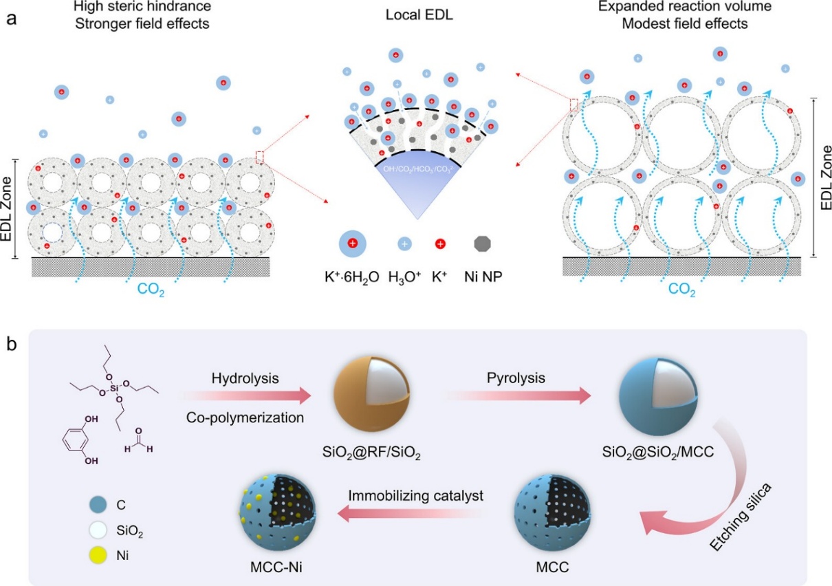Scheme 1.(a)催化剂几何结构调控EDL分布对eCO2R过程中传质和电荷分布的影响示意图;(b)Ni负载的多孔纳米笼模型催化剂MCC-Ni-x-y的合成路线示意图。