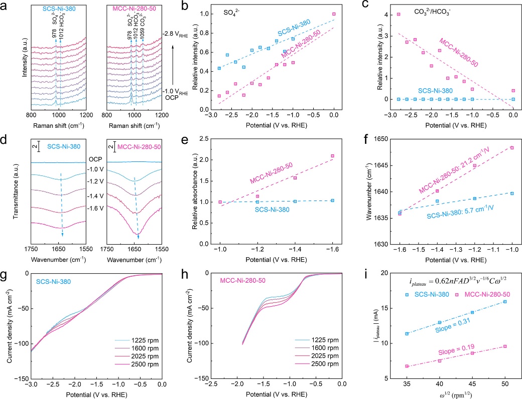 图3.原位光谱电化学技术阐明SCS-Ni-380与MCC-Ni-280-50间几何结构差异对EDL微环境的影响。