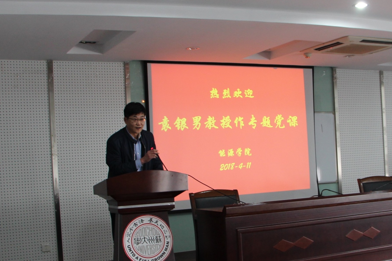 4月11日下午2:30,苏州大学原副校长袁银男教授在物科楼409作题目为《学习党章忆初心 旗帜鲜明讲政治》的专题党课,能源学院的全体党员老师、物理与光电·能源学部分党校学习积极分子和预备党员出席了会议。会议由陶智书记主持。