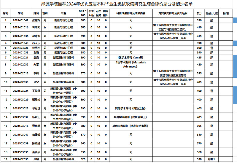 根据《能源学院推荐优秀应届本科毕业2024年免试攻读研究生实施细则》,经学生本人申请,学院推免专家小组评审,能源学院拟推荐优秀应届本科毕业生2024年免试攻读硕士研究生名单如下: