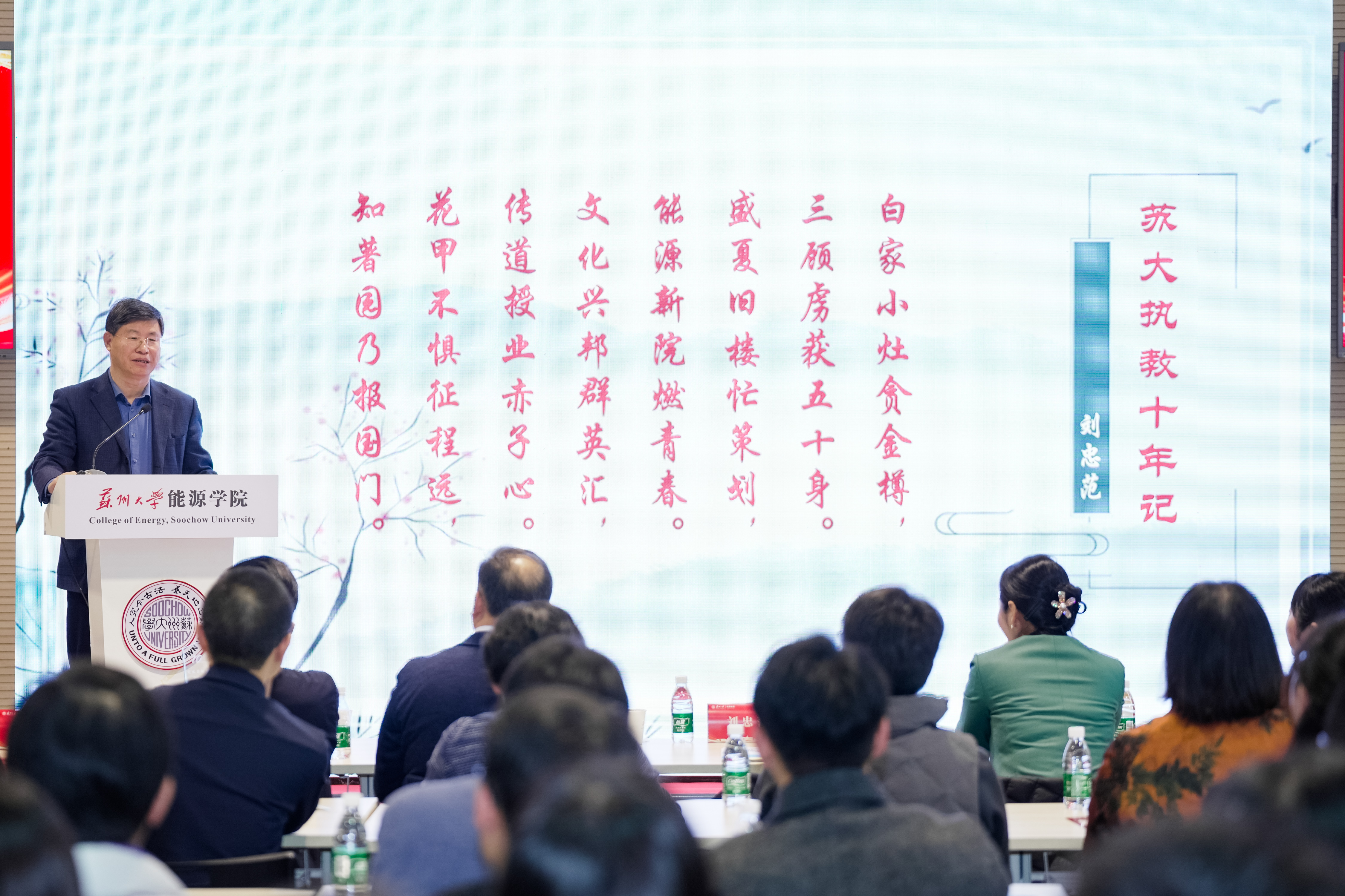 张正彪副校长代表学校向各位专家、嘉宾的到来表示欢迎,向长期以来关心支持苏州大学,特别是支持能源学院建设发展的领导、专家表示感谢。他从办学历史、发展规模、目标愿景等方面介绍了学校总体情况,并从创建背景、创新突破、未来蓝图三个板块感谢十年来刘忠范院士对能源学院建设发展的引领和付出,并期待能源学院在人才培养、科学研究、社会服务等方面高质量发展的未来。
