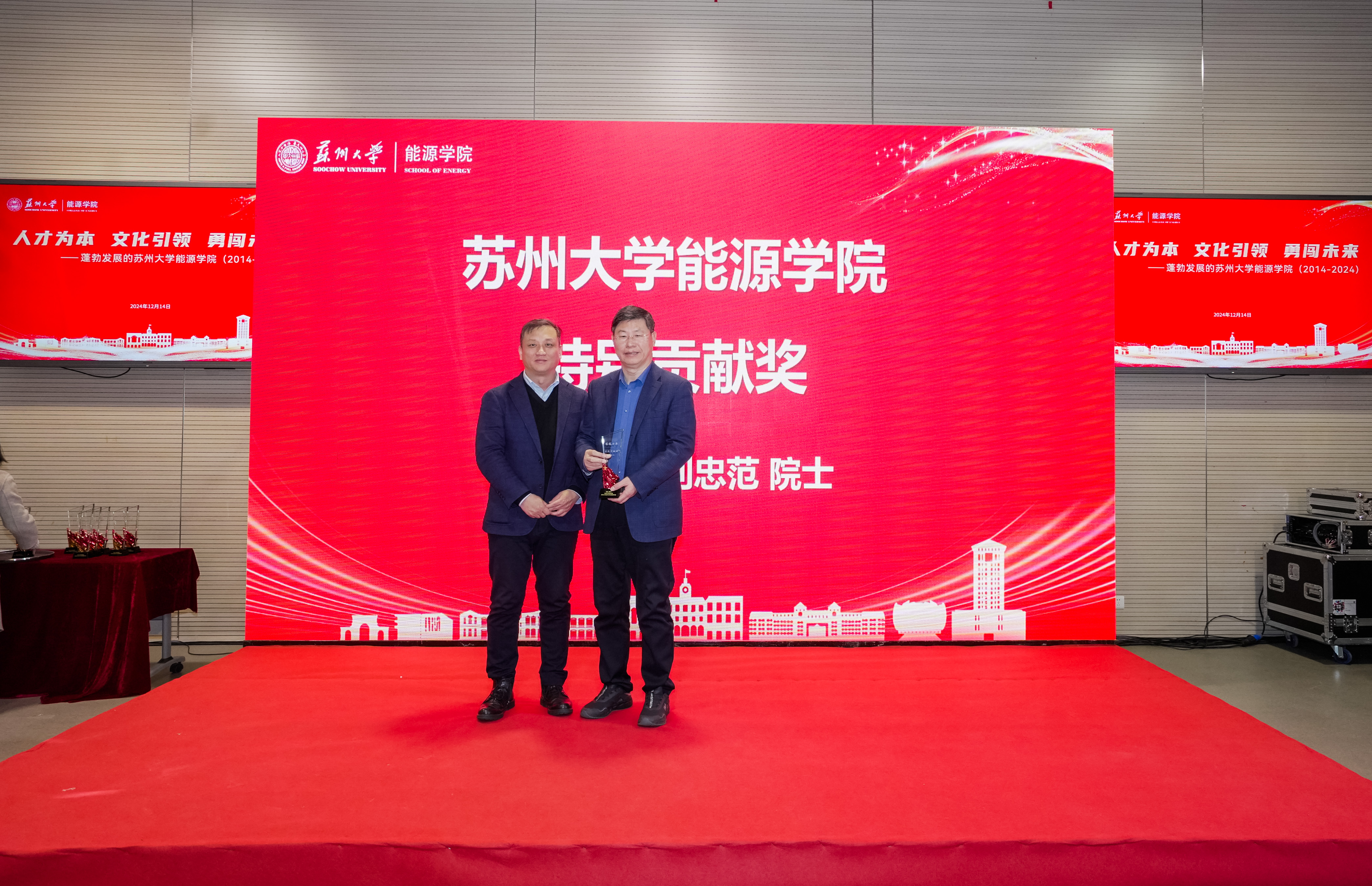 刘忠范院士用“白家小灶贪金樽,三顾虏获五十身。盛夏旧楼忙策划,能源新院燃青春。文化兴邦群英汇,传道授业赤子心。花甲不惧征程远,知著园乃报国门。”这56字七言律诗,总结感言了与苏州大学结缘渊源、能源学院十年引领指导及展望未来的赤子雄心,并对能源学院的学科建设、文化创新、学术科研提出了新的要求与期望。最后,刘忠范院士决定在能源学院设立总额100万元“范莉俊锋杰出学者奖”奖学金,并由许莉总裁现场隆重发布。这项奖学金,是对刘忠范院士过往十年苏大教育生涯的深情回顾,承载着刘忠范院士对苏大能源学院未来人才培养的坚定信念和殷切期待。