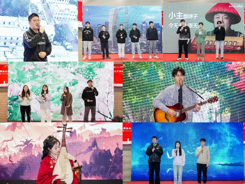 晚会伊始,尹万健课题组冯凯威、陈光明、罗若铭带来合唱《我的歌声里》。他们配合默契,歌声悠扬,营造出温馨氛围,观众沉浸其中。张金灿课题组王梓旗的吉他弹唱《遇见》,弹奏技巧娴熟,歌声富有感染力,与台下观众互动良好,带来独特感受。孙靖宇课题组的连雪玉身着一袭典雅的汉服,手持琵琶,端坐于舞台中央,一曲《兰陵王入阵曲》以其雄浑悲壮的旋律,讲述了古代名将兰陵王的英勇事迹,展现了中华民族的英雄气概。还有《上春山》《孤勇者》《独家记忆》等歌曲节目。演唱者们各展风采,或深情或激昂,为联欢会增添色彩。