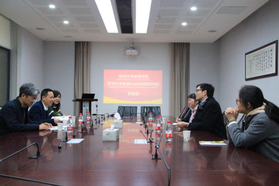 2018年12月4月上午,温州大学化学与材料工程学院院长王舜、温州大学研究生院副院长邹超一行来我院交流访问。苏州大学能源学院院长晏成林、党委副书记沙丹丹、副院长彭扬、副院长杨瑞枝、副院长戴晓陪同一起参加了此次活动。