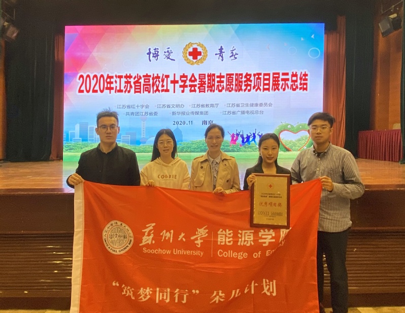 11月20日,由江苏省红十字会、省文明办、省教育厅、省卫健委、团省委、新华报业传媒集团、省广电总台联合开展的2020年全省高校红十字会“博爱青春”暑期志愿服务项目评选、展示、总结活动在江苏省会议中心成功举行。经团队汇报展示和相关评委评议,苏州大学能源学院“筑梦同行·朵儿计划”团队从进入决赛的51所高校的60个团队中脱颖而出,获得十佳项目殊荣。