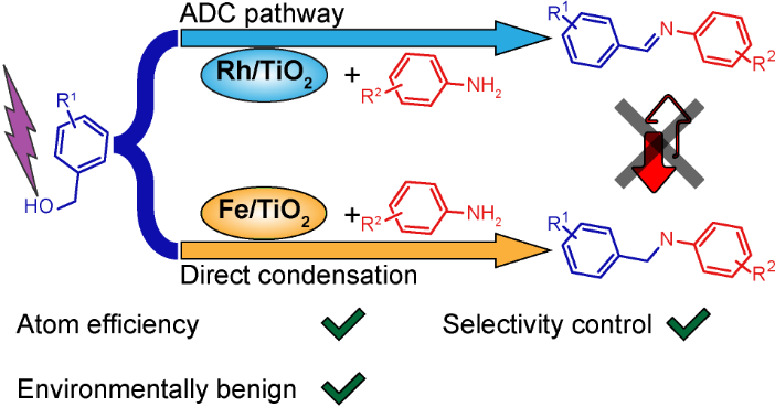 近日,苏州大学苏韧课题组与北航郝维昌课题组在Applied Catalysis B: Environmental期刊上发表题为“Metal Cocatalyst Mediated Photocatalytic Dehydrogenative-Condensation and Direct Condensation Cross-Coupling of Aniline and Alcohol “的研究工作。本文作者提出一种金属助催化剂调控产物选择性的策略来实现不对称亚胺和仲胺的合成。这种方法通过简单地使用金属助催化剂来调控光催化过程中醇的活化,可以通过两种不同的反应路径(ADC和BH)实现不同偶联产物的生成,从而实现高效的选择性控制。