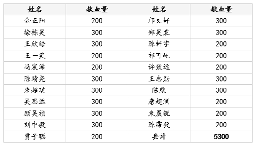 经统计,本次无偿献血活动共有21名能源学院学子成功献血,总献血量达5300毫升。以下为部分参与同学的献血记录(单位:毫升):
