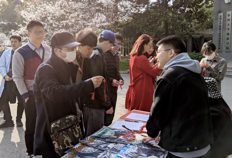 堆满礼品的兑奖台和樱花大道相映成趣,构成一道亮丽的风景线。看着苏大文创T恤、帆布包、钥匙环和樱花味薯片等精美礼品,大家攥紧了手里的题卡,答题热情持续高涨。