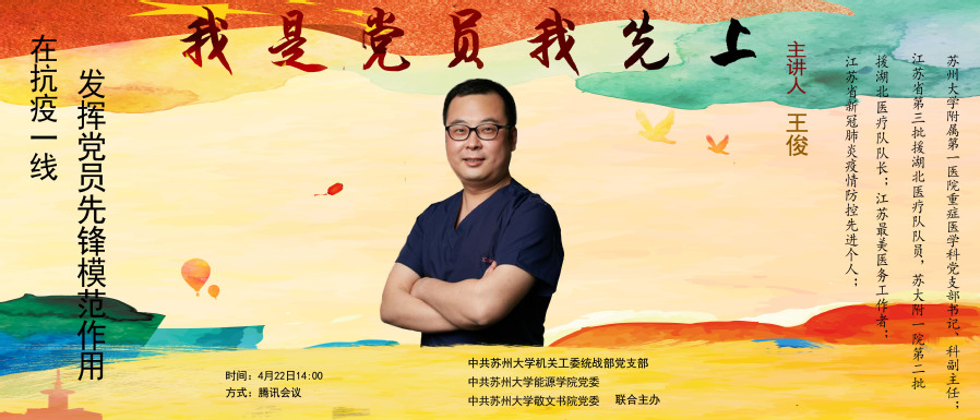 为进一步激发本期分党校培训班学员的学习积极性,切实发挥党组织的战斗堡垒作用,2020年4月22日14:00,能源学院分党校、敬文书院分党校开展了以“我是党员我先上”为主题的“云”党课。本次党课有幸邀请到苏州大学附属第一医院重症医学科党支部书记、科副主任、苏州援鄂医疗队硬核七人组组长王俊同志与大家分享经历,能源学院、敬文书院全体党员师生、分党校学员参加了本次线上专题党课,本次会议由能源学院党委书记沙丹丹主持。