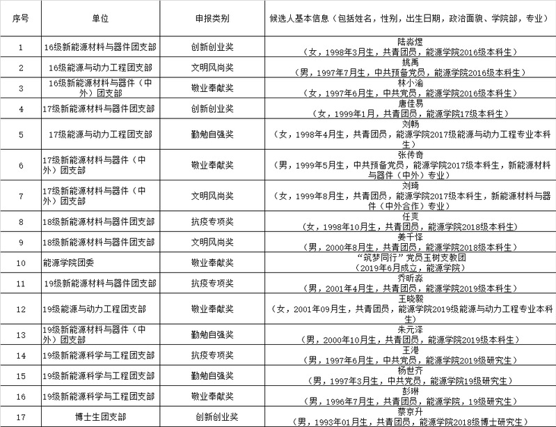 根据校团委相关通知精神,能源学院团委认真完成相关提名工作,现将“苏州大学五四青年奖”学院的年级提名奖的个人或集体予以公示: