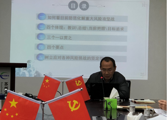 会议最后一项议程是党委理论中心组学习会议,本次学习由学院党委组织委员祝贺老师领学。祝贺老师从如何看目前防范化解重大风险攻坚战、强调忧患意识的四个体现等角度深入学习并讨论了“增强忧患意识,防范风险调整”,引导全体党员树立应对各种风险挑战的坚定信心以及更好地坚守为人民谋幸福、为民族谋复兴的初心和使命。