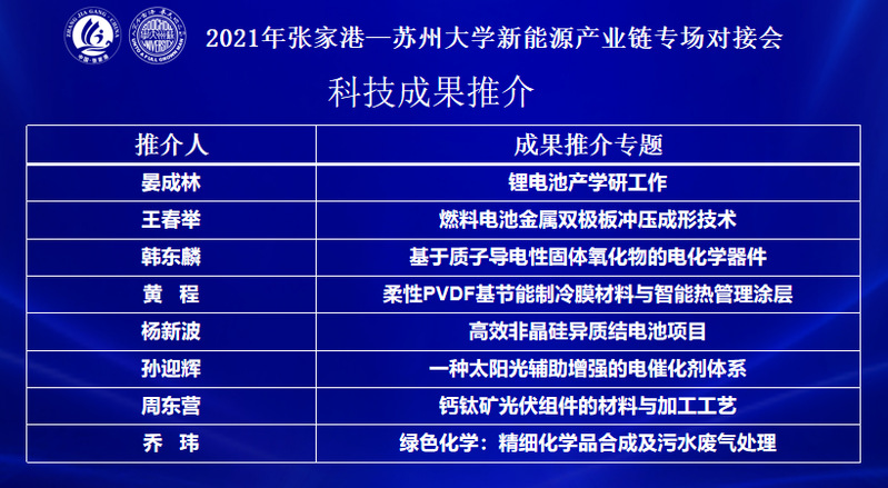 活动期间,苏州大学韩东麟、王春举、黄程、杨新波、孙迎辉、周东营、乔玮就燃料电池、太阳能光伏等领域的科技成果作推介,并与张家港的企业家们针对技术难点进行对接洽谈。