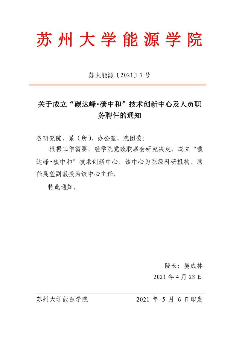 关于成立“碳达峰 碳中和”技术创新中心及人员职务聘任的通知 苏大能源〔2021〕7号