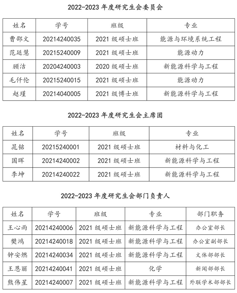 根据《苏州大学学生会(研究生会)深化改革实施方案》,我院于2022年9月23日召开能源学院第二次研究生代表大会,大会采用无记名投票方式选举产生了新一届研究生会委员会、研究生会主席团、研究生会部门负责人,现将名单予以公示。