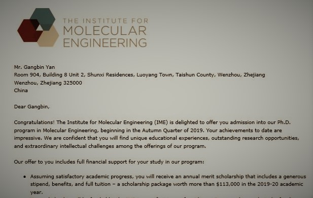 临近毕业,他收到了美国芝加哥大学、加州大学洛杉矶分校、康奈尔大学、加拿大多伦多大学四所学校的录取通知书,最终他选择在芝加哥大学追求科研梦想。