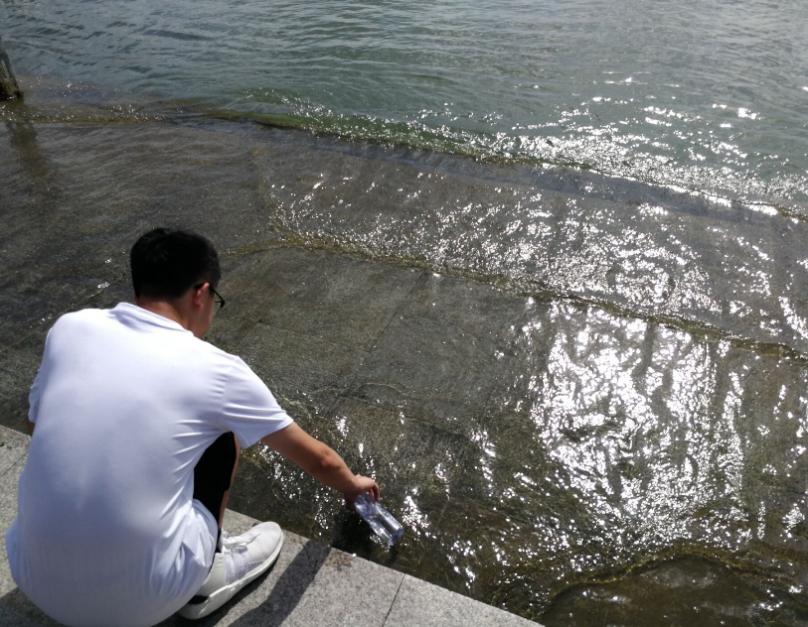 到达了湖畔,成员们拿出准备好的水瓶,采集了水源,将ph试纸拿出,将水滴了几滴在试纸上,很快,反应产生了,对比着相应的颜色标识,观察到水是稍显酸性的,接近7。此外,成员们还对当地的土地进行了温度的测量,在没有阳光直晒的地方是30.8℃,在有阳光直晒的地方是35.3℃。离开湖畔的路上,队员们密切关注着园内的环境,一旦发现有垃圾,便将其拾起。